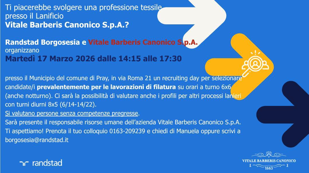 Presso il Municipio del comune di Pray, in via Roma 21 un recruiting day per selezionar candidate/i prevalentemente per le lavorazioni di filatura su orari a turno 6x6 (anche notturno). Ci sarà la possibilità di valutare anche i profili per altri processi lanieri